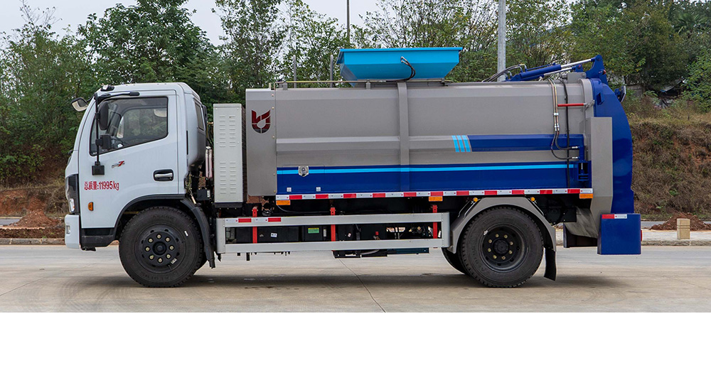 垃圾箱底部設置大量過濾孔,實現(xiàn)箱內餐廚垃圾固液的初步分離,裝載能力強并配備有大容量污水箱;配套液壓驅動高壓清洗系統(tǒng),可對整車及工作裝置進行清洗。