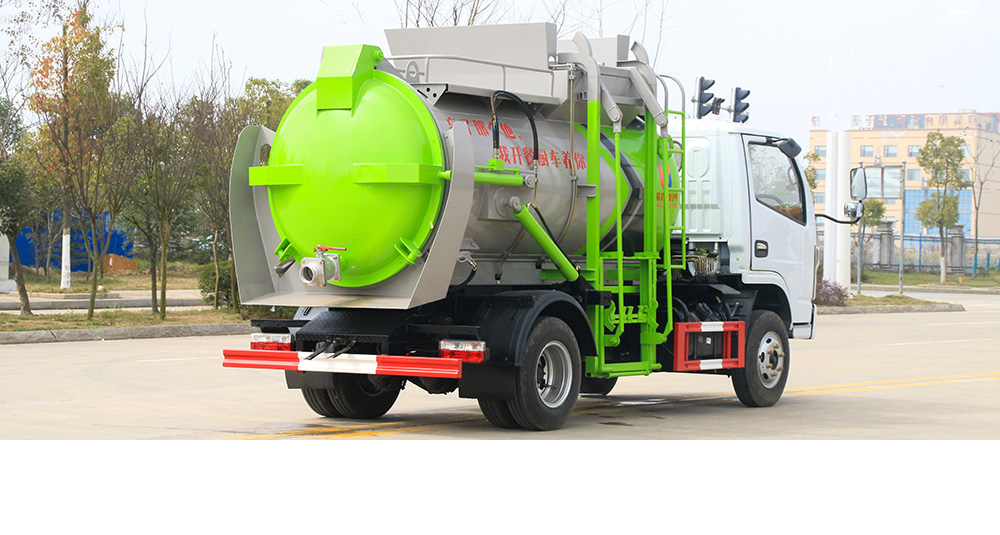 垃圾箱底部設(shè)置大量過濾孔,實(shí)現(xiàn)箱內(nèi)餐廚垃圾固液的初步分離,裝載能力強(qiáng)并配備有大容量污水箱;配套波壓驅(qū)動高壓清洗系統(tǒng),可對整車及工作裝置進(jìn)行清洗。
