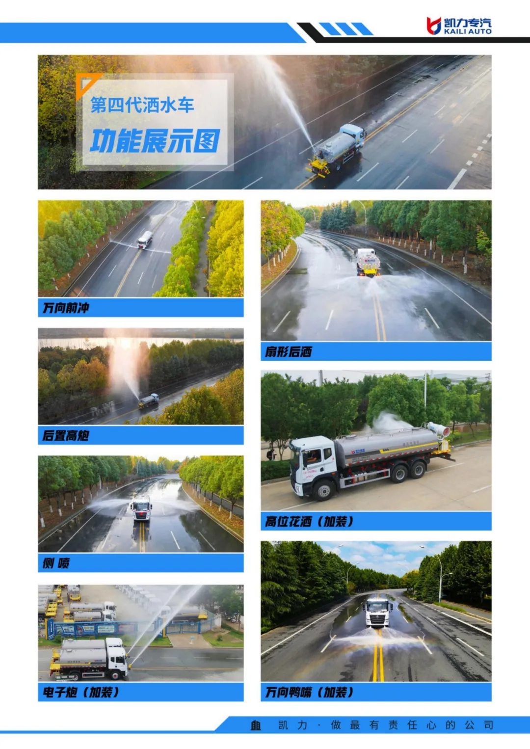 產(chǎn)品標配前沖、后灑、側(cè)噴、后置式工作平臺、平臺上有高壓水炮(可360°旋轉(zhuǎn),水霧形狀可調(diào)成直沖狀、 大雨、 中雨、 小雨、毛毛雨;調(diào)成直沖狀最大射程≧ 35 米,也可調(diào)成霧狀最大射程≧15 米)、配備優(yōu)質(zhì)大功率專用灑水泵,品牌取力器、雜物過濾網(wǎng)、國標通用 65型消防接口(可通過消防栓加水)、1 套自流球閥系統(tǒng)(可自吸自排,最大吸程 7 米)、2根引水鋼絲膠管。適用于各種路面清洗;樹木、綠化帶、草坪綠化;道路、廠礦企業(yè)施工建設(shè)、高空建筑沖洗。具有灑水、壓塵、高(低)位噴灑、農(nóng)藥噴灑、護欄沖洗、應(yīng)急消防等多種功能。