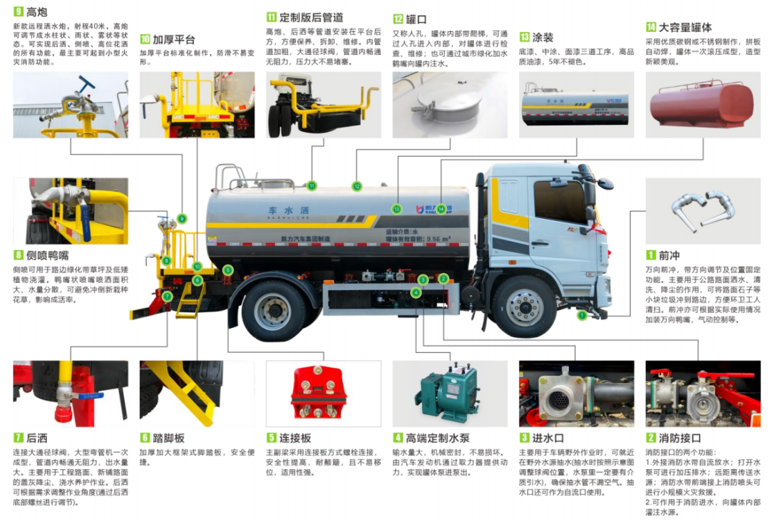 升級(jí):管道、細(xì)節(jié)、設(shè)計(jì)全面升級(jí),采用定制版大功率水泵,前沖可達(dá)雙向8車道、后灑可達(dá)雙向4車道,高炮可達(dá)40米,罐體與副梁采用連接板螺栓連接,不易移位更牢固安全。