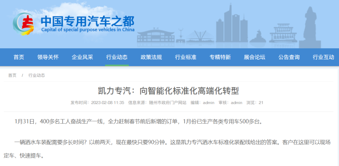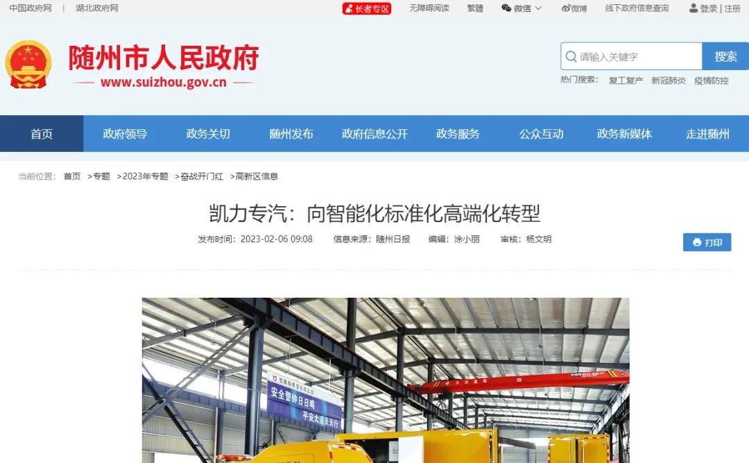 ● 隨州日報頭版頭條《凱力專汽:向智能化標(biāo)準(zhǔn)化高端化轉(zhuǎn)型》特別報道,用品質(zhì)贏得市場,加快產(chǎn)品研發(fā)、技術(shù)升級、品質(zhì)提升、力爭高附加值產(chǎn)品大幅提高占比,向智能化標(biāo)準(zhǔn)化高端化轉(zhuǎn)型升級。隨州市人民政府官網(wǎng)、隨州日報、隨州電視臺綜合頻道、隨州市經(jīng)濟(jì)和信息化局官網(wǎng)、隨州日報抖音官方號、隨州論壇、云上隨州等媒體平臺跟蹤報道。