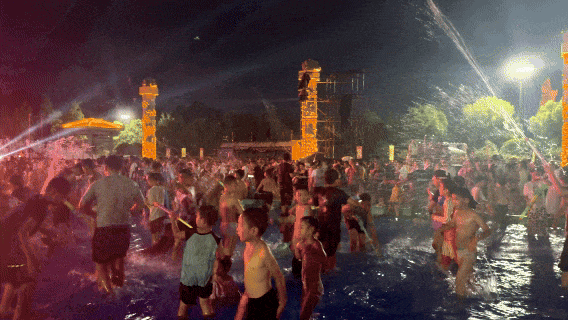 夜幕之下,萬余名游客的歡聲如潮水般涌動。傣迪潑水電音節(jié)的強(qiáng)勁節(jié)拍、煙花秀的漫天華彩、夢幻熒光秀的流光溢彩,共同點(diǎn)燃了“水火交響狂歡夜”的夏日激情。
