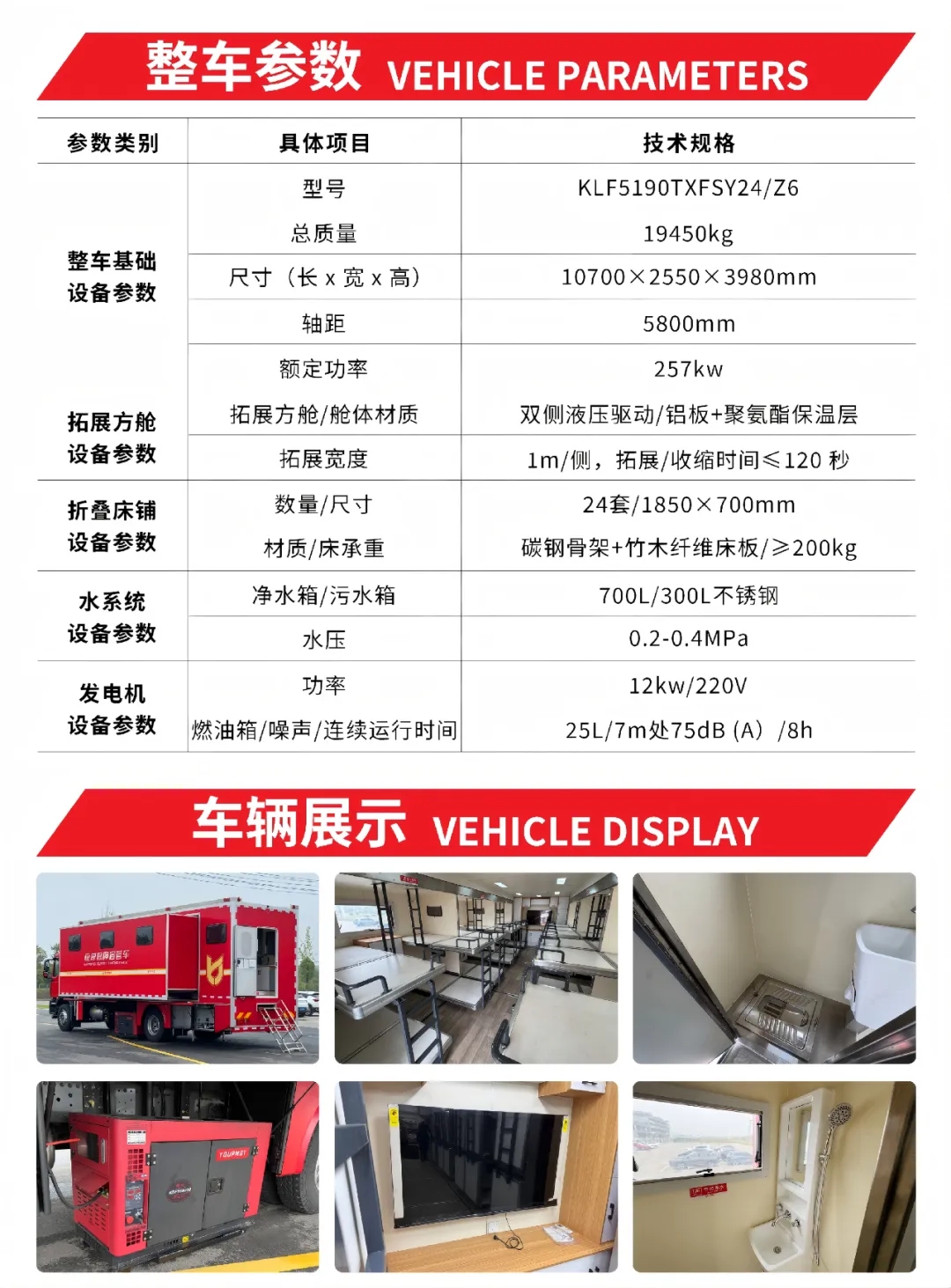 車內配備24套折疊床鋪,配備USB充電口、LED閱讀燈、儲物網(wǎng)兜,全車集成獨立儲物柜。含獨立衛(wèi)生間,滿足淋浴、如廁、洗漱功能。不銹鋼材質的700L凈水箱和300L污水箱,保障基本需求。還集成55寸4K電視、30L冰箱、冷熱飲水機、2臺1.5P冷暖空調等家用電器,提升生活品質。配備12KW發(fā)電機,保障整車自供電能力。