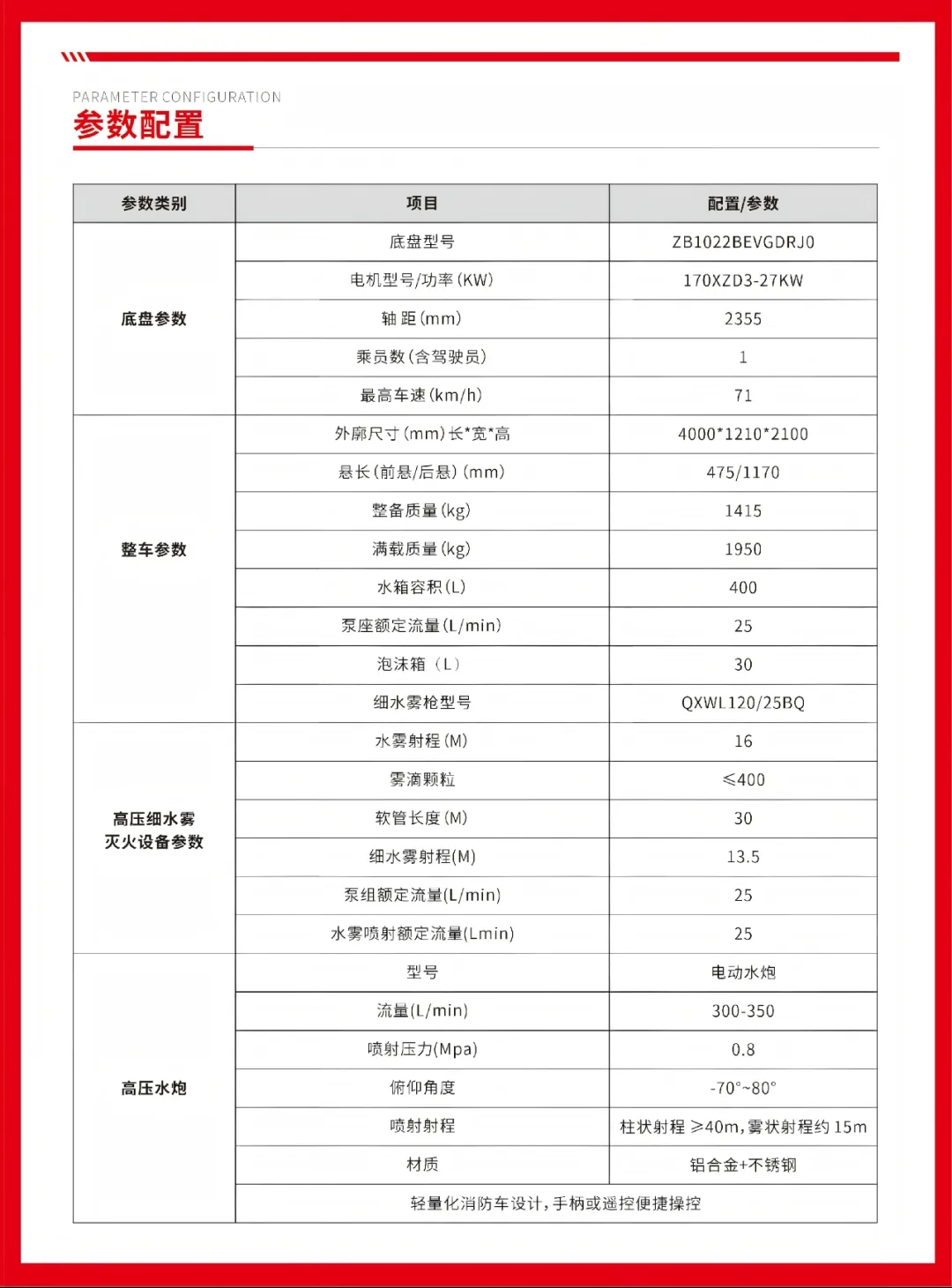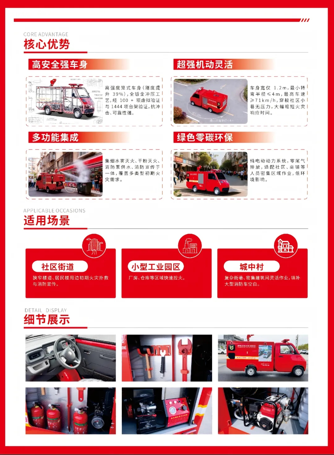 凱力風牌大神童純電動多功能消防車,是一款輕量化消防裝備,機動靈活、功能高效,是社區(qū)街道、小型工業(yè)園區(qū)及狹窄區(qū)域消防巡邏、日常消防宣傳與初期火災撲救的理想選擇。